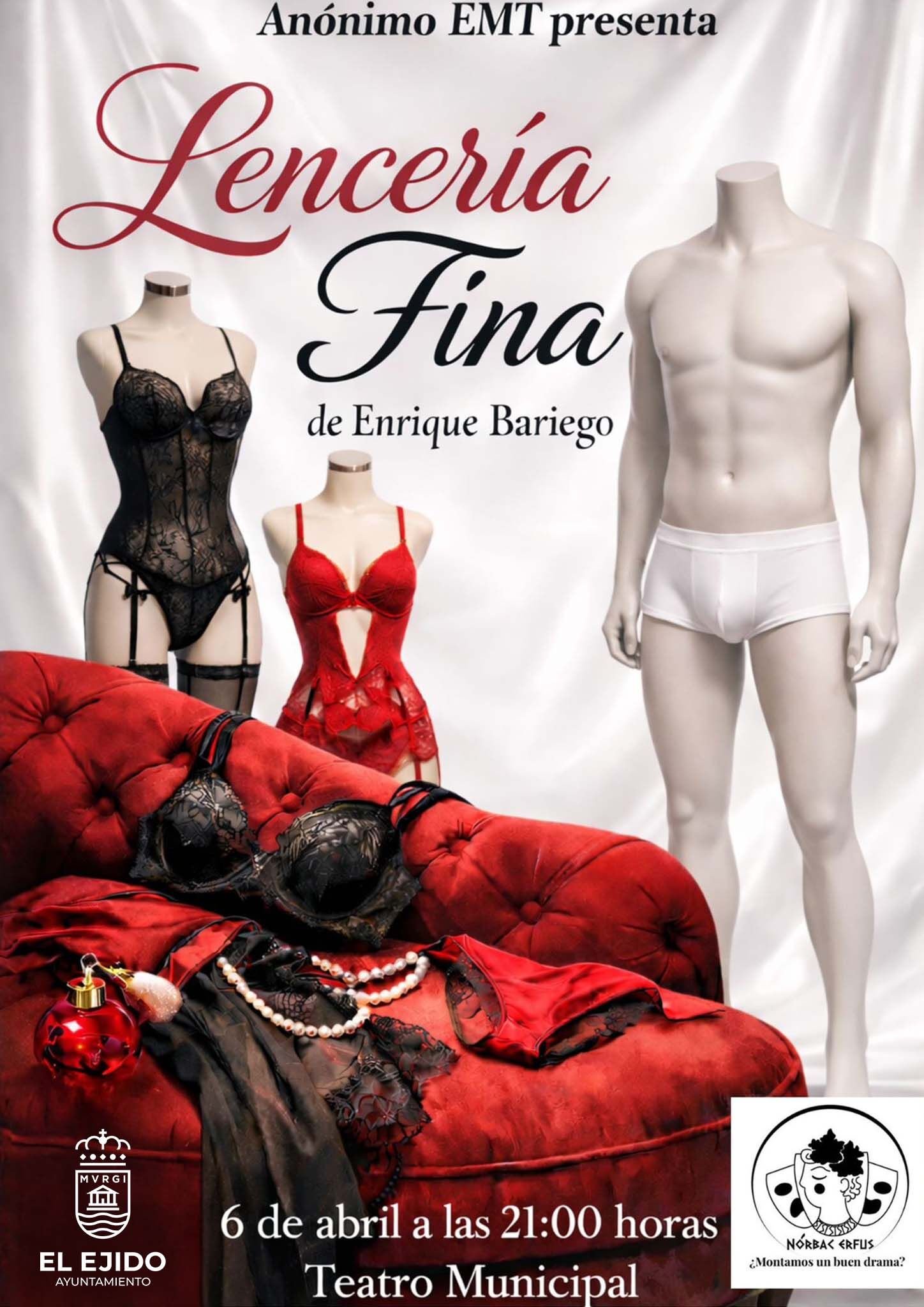 Teatro de Teatro con EMT Anónimo "Lencería fina" en El Ejido, El Ejido (Almería), el Lunes 6 de Abril del 2026 a las 21:00 en Teatro Municipal de El Ejido situado en C/Pablo Neruda, 17 - 04700 El Ejido (El Ejido), El Ejido, Almería. Con un precio de entrada de - . A través del grupo de teatro Con una calificación de Sin clasificar.