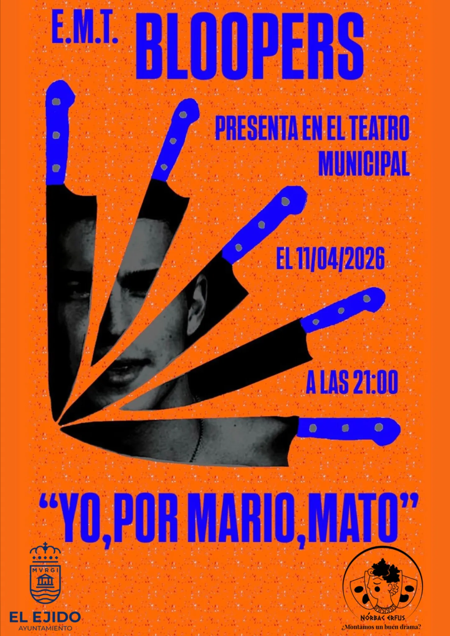 Teatro de Comedia con EMT Bloopers "Yo, por mi Mario, mato" en El Ejido, El Ejido (Almería), el Sábado 11 de Abril del 2026 a las 21:00 en Teatro Municipal de El Ejido situado en C/Pablo Neruda, 17 - 04700 El Ejido (El Ejido), El Ejido, Almería. Con un precio de entrada de - .(Puedes comprar tu entrada en El grupo vende las entradas.). Con una calificación de No recomendado para menores de 6 años