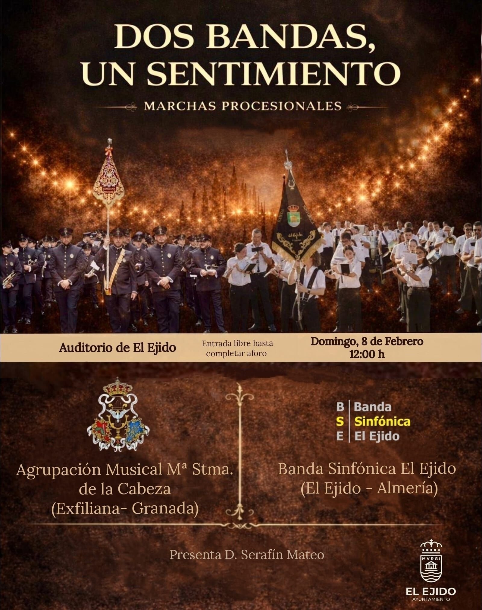 Música de Concierto con Encuentro musical "Dos bandas, un sentimiento" en El Ejido, El Ejido (Almería), el Domingo 8 de Febrero del 2026 a las 12:00 en Teatro Auditorio de El Ejido situado en Plaza Teniente Arturo Muñoz, 1 - 04700 El Ejido (El Ejido), El Ejido, Almería. Con un precio de entrada de Gratis . Con una calificación de Apto para todos los públicos.